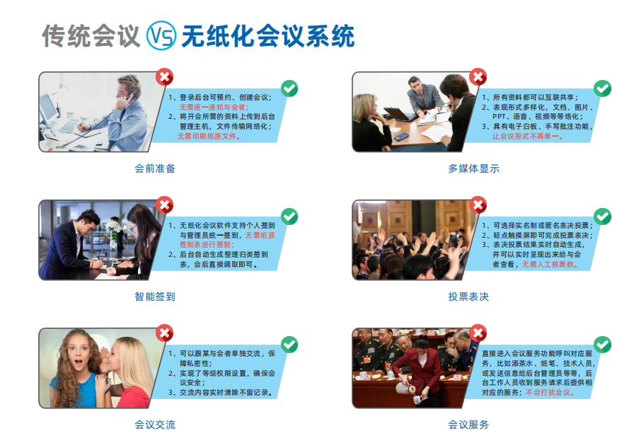随着经济的快速发展,会议模式也呈现出快速发展的趋势。通过不断地改革更新、引进新技术,无纸化会议系统慢慢走进人们的视野。由于会议效率低,传统会议模式已无法跟上信息时代步伐。这种模式的缺点是众所周知的,会前:需准备大量纸质会议资料,会中:无法实时清楚发表意见,投票过程复杂且不严谨,会后:需销毁大量会议资料,这样的会议模式非常不符合当前的的电子化办公的要求。