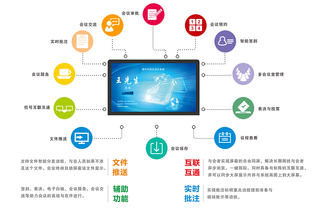 无纸化会议系统是一款专为政府党政机关、企事业单位、大型集团企业量身定制的无纸化会议系统,提供强大的会议应用功能,包括:会议信息上传、文件分发、阅读查看、文件批注、会议签到、投票表决、电子白板、文件交互传送、视频交互传送、会议交流、信息通知、会议服务、信息记录等;具有功能丰富、界面简洁直观、操作便捷、稳定可靠等特点;能够帮助会议组织者极大地降低工作压力,轻松进行会议现场管控,提高与会者的开会效率,同时节省大量资料印刷费用和投影设备,完全符合国家低碳、环保理念。