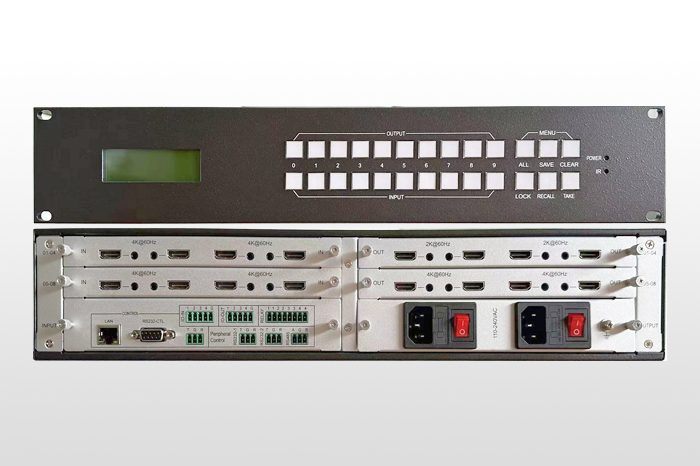 1. 采用嵌入式架构,无操作系统,最大支持8X8路HDMI/DVI-I/VGA/YCBCR/CVBS/SDI/HDBaseT/LC单模单纤光纤信号输入、HDMI/DVI-I/VGA/YCBCR/CVBS/SDI/HDBaseT LC单模单纤光纤信号输出;